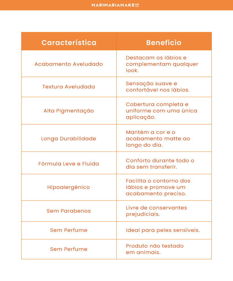 Cores Vibrantes: Disponível em uma gama de cores intensas que destacam seus lábios e complementam qualquer look. Textura Aveludada: Proporciona uma sensação suave e confortável nos lábios, sem ressecar. Alta Pigmentação: Oferece uma cobertura completa e uniforme com apenas uma aplicação, garantindo lábios marcantes. Longa Durabilidade: Mantém a cor e o acabamento matte ao longo do dia, sem necessidade de retoques constantes. Fórmula Leve e Fluida: Desenvolvida para ser leve e fina, proporcionando conforto durante todo o dia sem transferir. Hipoalergênico: Adequado para todos os tipos de pele, minimizando o risco de alergias e irritações. Aplicador Moderno: Facilita o contorno dos lábios e promove um acabamento mais preciso e profissional.