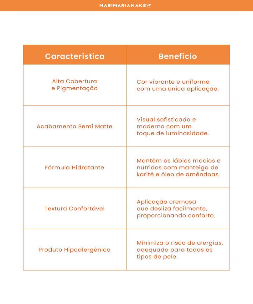 Alta Cobertura e Pigmentação: Oferece uma cor vibrante e uniforme com apenas uma aplicação, garantindo lábios intensos e marcantes. Acabamento Semi Matte: Proporciona um visual sofisticado e moderno, com um toque de luminosidade. Fórmula Hidratante: Enriquecido com manteiga de karité e óleo de amêndoas, ingredientes conhecidos por suas propriedades hidratantes, que mantêm os lábios macios e nutridos. Textura Confortável: Aplicação cremosa que desliza facilmente, proporcionando conforto durante todo o dia. Produto Hipoalergênico: Desenvolvido para minimizar o risco de alergias, adequado para todos os tipos de pele.
