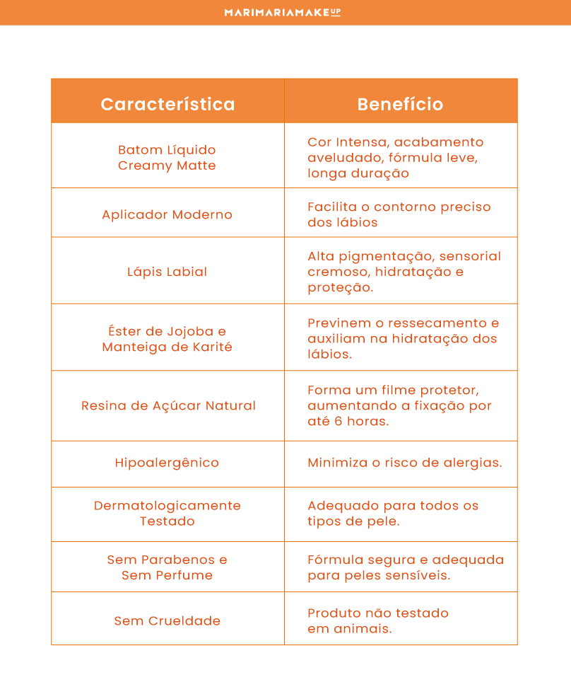 Lápis Labial: Alta Pigmentação e Sensorial Cremoso: Desliza facilmente, proporcionando um delineado preciso e intenso. Hidratação e Proteção: Contém Éster de Jojoba e Manteiga de Karité, que previnem o ressecamento e auxiliam na hidratação dos lábios. Fixação Prolongada: A resina de açúcar natural forma um filme protetor, aumentando a fixação do lápis por até 6 horas. Acabamento Matte: Proporciona um acabamento matte duradouro, sem comprometer o conforto dos lábios.