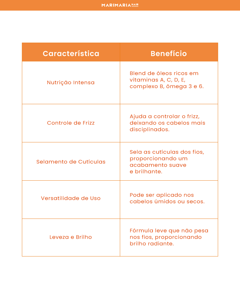 O Óleo Reparador 3 em 1 Vita Glow da Linha OX Mari Maria Hair é a solução ideal para cabelos ressecados e enfraquecidos que necessitam de nutrição intensa, controle de frizz e selamento das cutículas. Com uma fórmula rica em vitaminas e nutrientes essenciais, este óleo oferece múltiplos benefícios, proporcionando cabelos mais saudáveis, brilhantes e disciplinados, sem pesar nos fios.